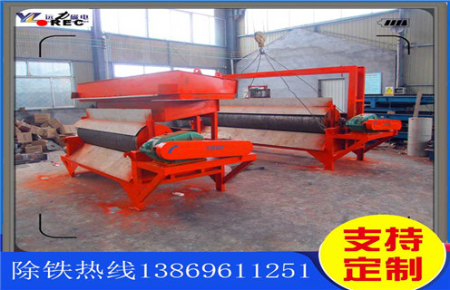 4、含有鐵磁性雜質(zhì)的物料通過(guò)受料斗經(jīng)電磁振動(dòng)給料機(jī)均勻的下到第一道輸送皮帶上,當(dāng)物料通過(guò)強(qiáng)磁輥時(shí),鐵磁性物質(zhì)被磁力吸引被吸附到強(qiáng)磁輥上,隨著皮帶的轉(zhuǎn)動(dòng)使其從磁場(chǎng)脫離并落入收集斗中。其它物料和沒(méi)有選凈的鐵磁性物質(zhì)隨溜槽進(jìn)入下一級(jí)磁選皮帶進(jìn)行分選,原理同上。最后選出合格的產(chǎn)品。